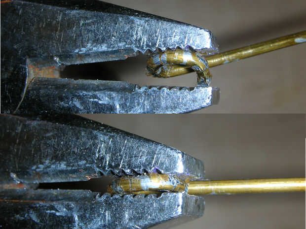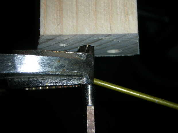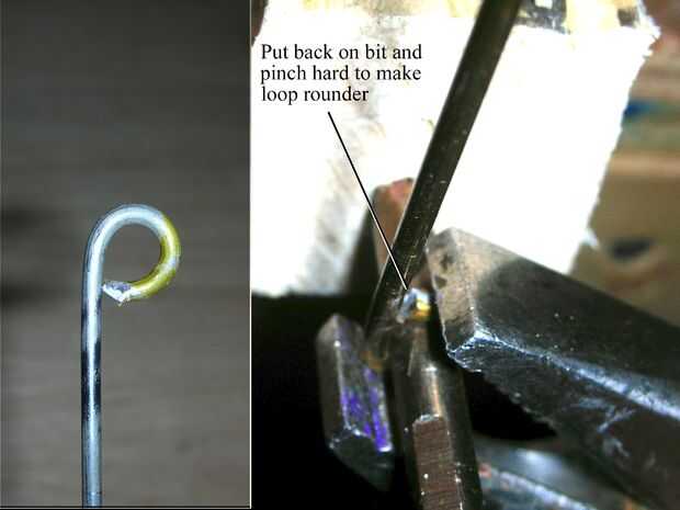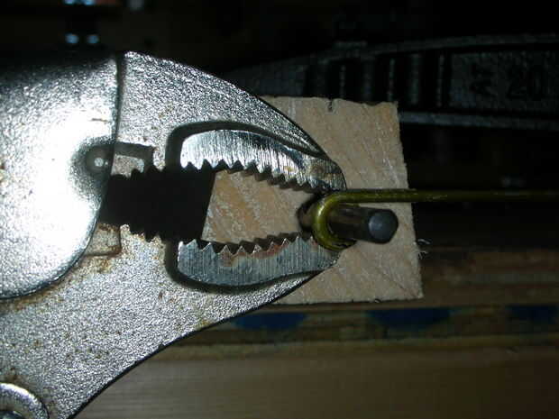 Fijar los puños de tornillo de banco para sujetar la punta del hilo en el eje de la broca - cuando usted mira los puños desde arriba, el cable debe apuntar en un ángulo de la esquina de las mordazas (ver foto 13). Con la mano o unos alicates, doble el cable alrededor del eje de la broca un completo 360 grados (14 y 15), luego suelte las asas.