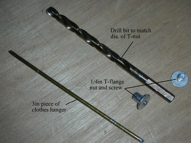 Ahora necesita un vástago hecho de cerca de 3 in de perchas de alambre y doblar como se muestra a alrededor de un T-nut (o post obligatoria). Para doblarla bien, he encontrado que una broca sirve como un buen molde (11). Sujete un trozo de 1-1/2 en la tabla de madera como se muestra y broca en el extremo de la pieza y retirar el taladro (12).