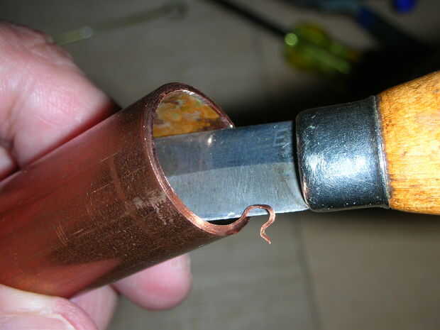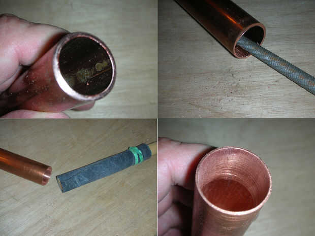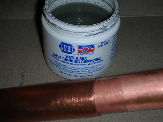 Para suavizar el interior de esta pieza sumerja el extremo de un pedazo más largo de 3/4 en tubo en la válvula compuesto de pulido (7) y pasan varios minutos pulido estos dos pedazos juntos y hacia atrás y redondo y redondo, hasta que deslice fácilmente. Esto puede ser bastante desordenado, así que use guantes de hule si se puede obtener un trapo o papel toalla y hacerlo salir. Lavar todo con abundante agua y jabón, utilizando un cepillo de dientes para limpiar los interiores de las piezas de tubería.