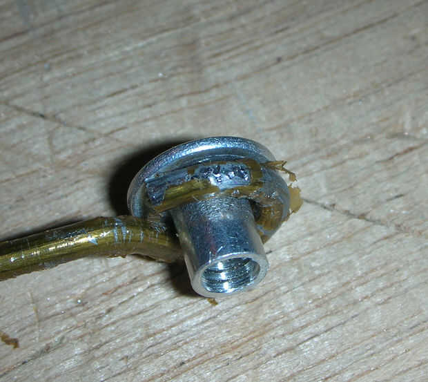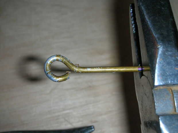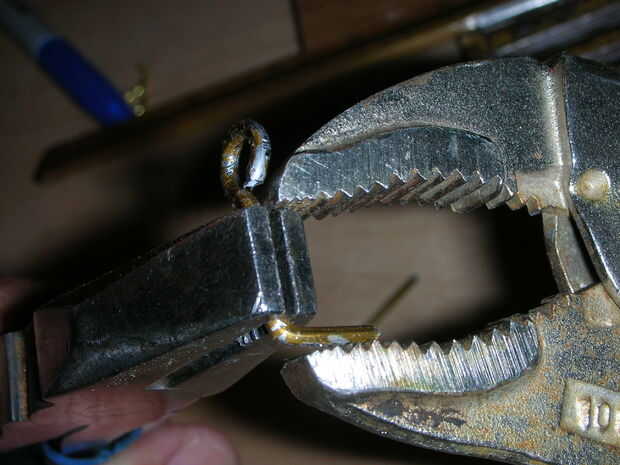 El cable ahora tiene una bonita cola de cerdo que tiene que ser recortadas (16) para que cuando se aprieta en línea (17) el bucle se cerrará completamente. Coloque el bucle en el eje de la broca (18) y pizca duro con las pinzas para cerrar el lazo apretado y hacerlo como redondo como sea posible.