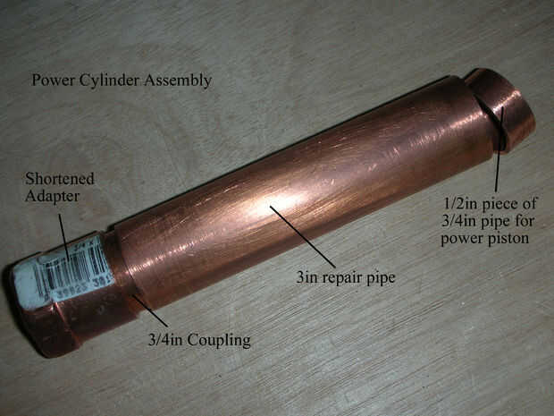 Cortar un 3,5 en sección de la tubería de reparación para el cilindro de potencia (5). Usted tendrá que cortar las rebabas del interior de ambos extremos de esta pieza (6). Un extremo debe deslizarse sobre el acoplamiento del adaptador, y el otro debe ser muy liso para recibir el pistón de potencia.