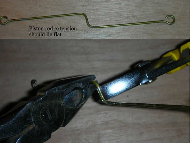 Llevar el pistón fuera del cilindro, desenrosque la tuerca de T y desconecte la varilla de extensión del pistón. Agregar dos pulgadas desde la marca que acaba de hacer en la barra de la extensión (2), corte el cable y hacer otro bucle en el otro extremo, tratando de mantener este lazo en el mismo plano que el primero que mienten en la mesa.
