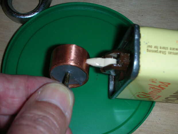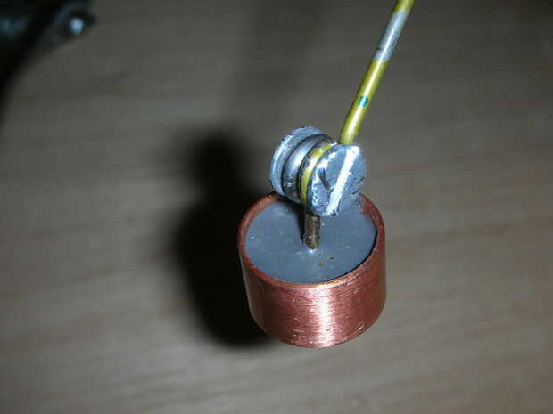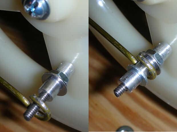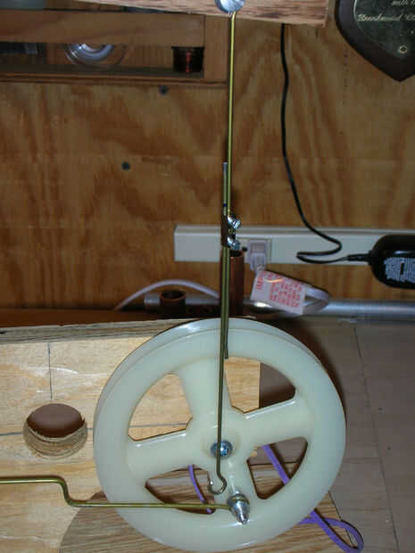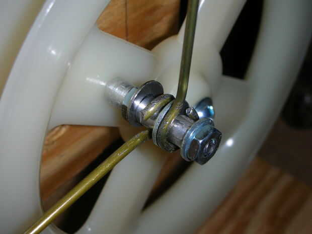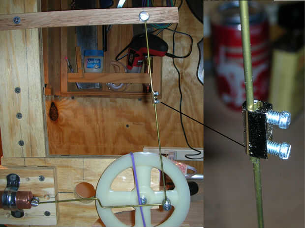 Ahora tenemos que hacer una barra de extensión conecta la varilla del pistón con el brazo de la polea. Como en el paso 4 con la barra de pistón, pero con al menos una pieza de 10 pulgadas de percha, hacer un lazo para ajustar la tuerca de T corto. Entonces Únete a este bucle con el lazo del vástago mediante un tornillo 1/4 y coloque el otro extremo de la varilla en el brazo de la polea (1). Marque el punto en el alambre donde toca el brazo de la varilla del pistón en la polea.