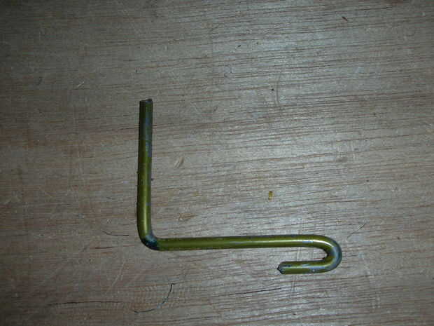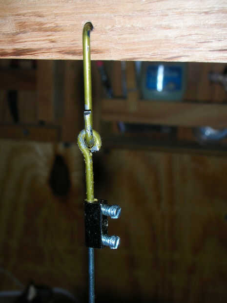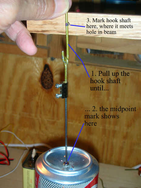 Apoyo de la polea con una banda elástica como antes para que el brazo de la polea es a 3:00 y la viga es nivel. Ponga el gancho a través del lazo y tire de la varilla de desplazamiento hasta la marca del punto medio que hiciste anteriormente muestra justo encima de la entrerrosca del rayo. el agujero sólo perforó en la viga y donde el eje del gancho se encuentra con este orificio (5). Doblar el gancho de 90 grados en esta marca, asegurándose de que el gancho quede plano cuando se hace (6).