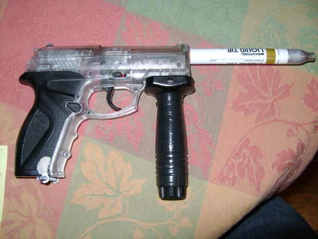 si siempre te quedas sin municiones al usar una pistola de la máquina, entonces esto es para ti.Se necesita2 botellas de agua de la misma clasepegamento calienterifle de aire que necesita una tolvaPaso 1: Poner en el "adaptador" Esta es la parte