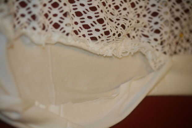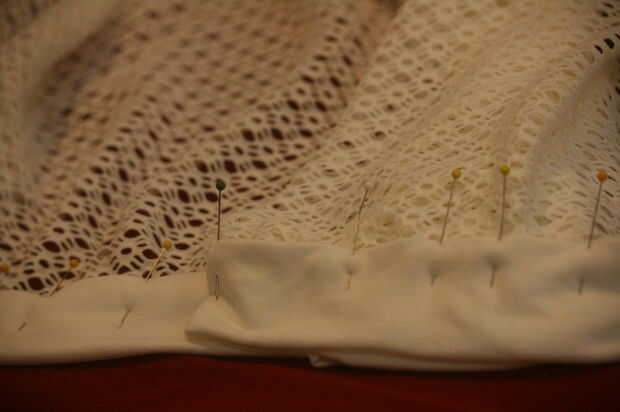 Gire el borde de la banda de la cintura debajo de cerca de 1 pulgada y doblar para que coincida con la banda de la cintura donde hayan sido cosida en la falda. Prender toda la longitud de la banda de la cintura donde ha cosido a la falda. No olvide prender los extremos de la banda de la cintura, que será los lazos.