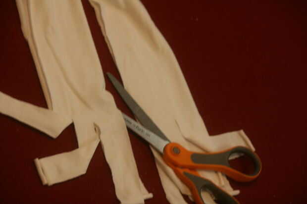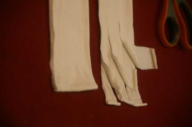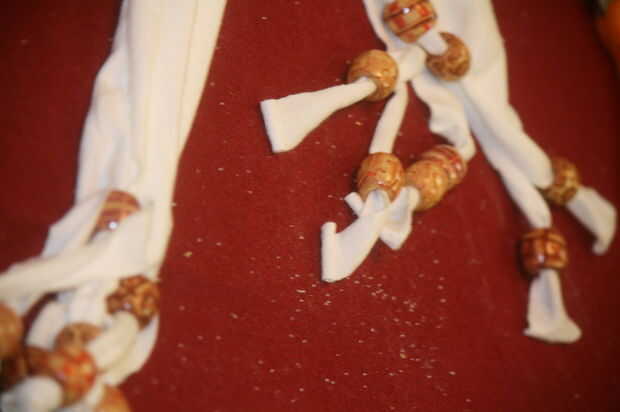 Cortar los extremos de los lazos en tiras, como largo o corta como quieras y en el reborde del hilo de rosca. Granos con un orificio grande se pase mejor.