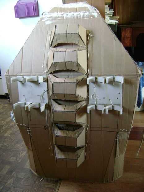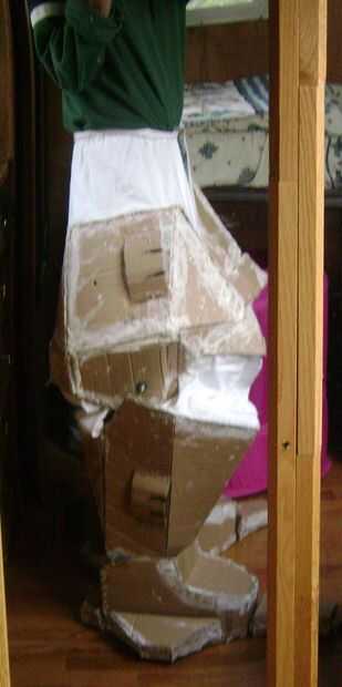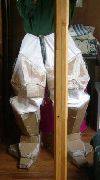 Cada pieza se ajuste a mi cuerpo durante la construcción. Para unirse a las piernas superiores e inferiores, paño cosido sobre la cartulina y luego cosido a un viejo par de pantalones con la cadena... Esto hace que las articulaciones flexibles.
