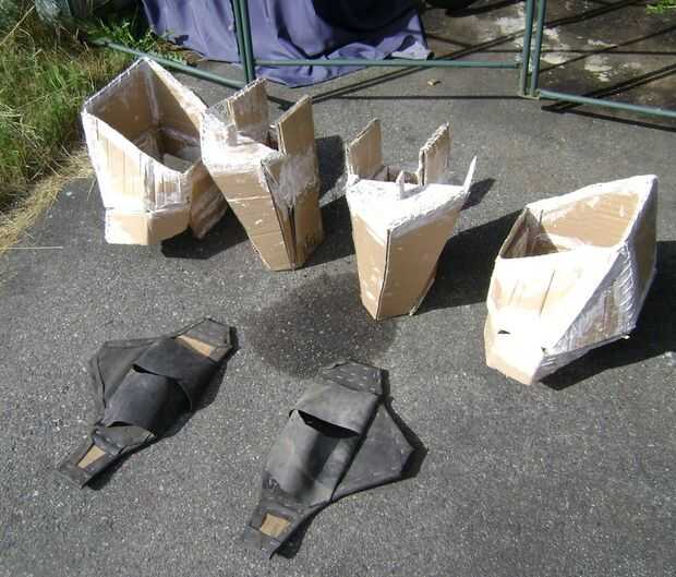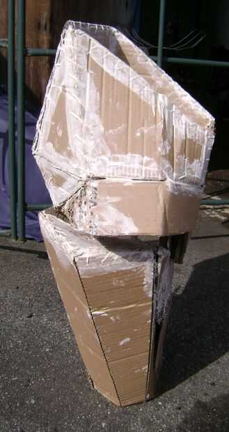 Uno de los cuadros muestra la parte posterior. Otro cuadro tiene algunas cosas de caucho negro en ella. Estos son los pies. Están hechas de cartón y papel maché también pero la goma que los pies flex mientras caminaba.