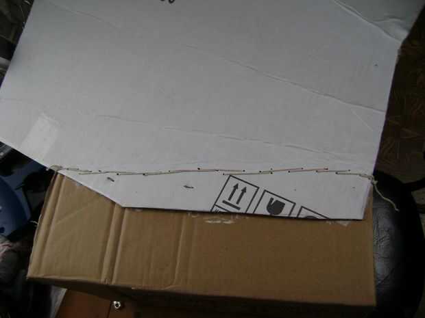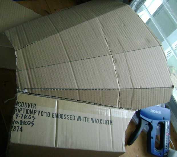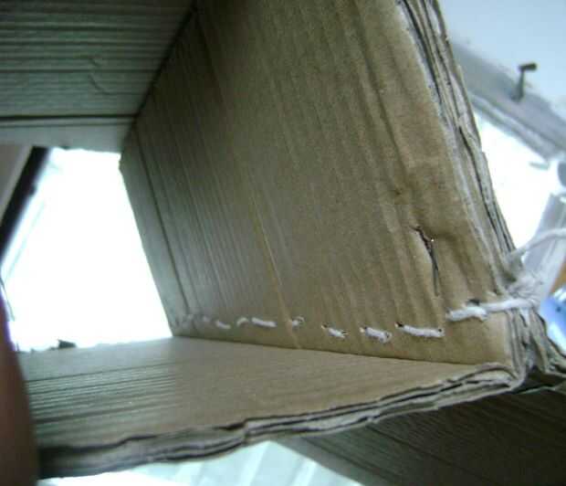 De experiencia previa, pegamento caliente o cualquier tipo de pegamento se rasgó el cartón si hizo hincapié en la cartulina. Ya que estaba usando papel maché, que iba a ser el pegamento. Pero no sería lo suficientemente fuerte mantener unida a la cartulina (aprendido que uno de experiencia así) así que cosí el cartón junto con cuerda y una aguja de coser muy grande. Creo que era una aguja de encuadernadores que compré en la tienda de dólar. También utilicé una grapadora de ferretería (ya tenía uno) para ayudar a mantener las cosas Unidas. Tuvo que doblar las partes posterioras de las grapas hacia abajo una vez que pasaron por el cartón, por lo que no había que sobresalgan los bordes.