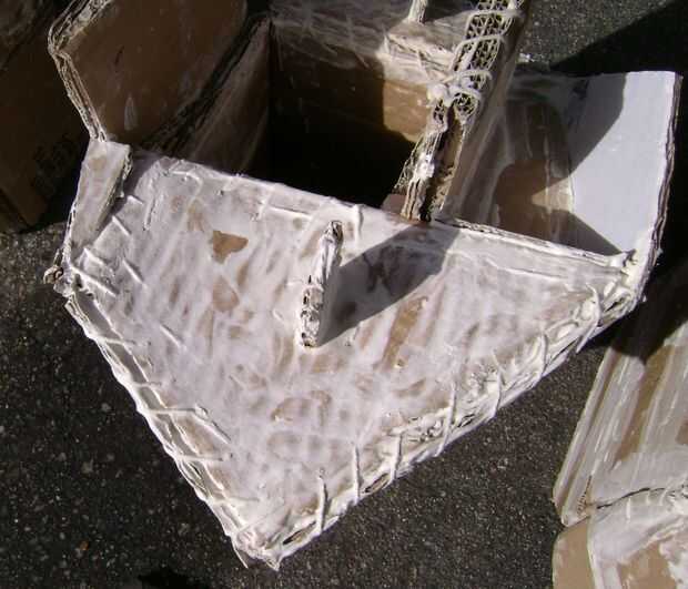 Antes de que el cartón era cosido y grapado, usé la mezcla de maché de papel (una pasta espesa de harina, agua y sal) entre los trozos de cartulina para pegar juntos. Entonces después de que fue puesto junto, otra capa de la mezcla se extendió sobre la cadena y grapas para ayudar a mantener en su lugar.