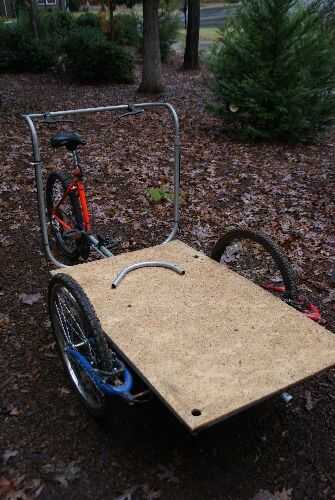 Todo esto fue una diversión primer triciclo de carga de la que aprendimos mucho. (Nota: la cama de carga y las ruedas están ahora sirviendo muy bien como un carro jardín.)