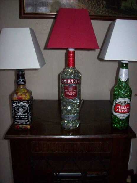 esta es una luz que se me ocurrió colgar encima de mi barra. Utiliza botellas de licor vacías y artefactos de iluminación. Para hacer la 1 luz, necesitará:1 botella de licor vacía (o vino)kit de luminaria de 1 lámpara ($10,97 en HD)1 25 equivalente c