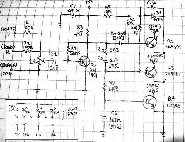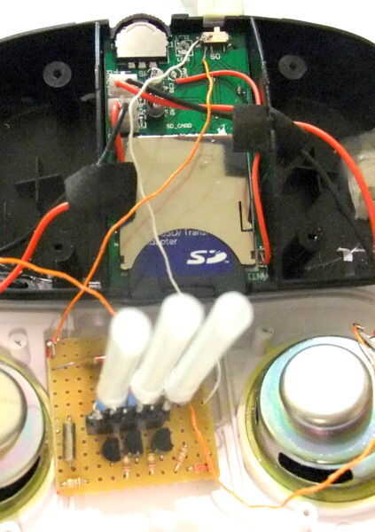 Para un amplificador pequeño como los altavoces mini utilicé, cambiar R1 y R2 de 10K y TR1 pueden ser saltados, así. Algunos closeups se incluyen para mostrar donde conecté los cables de señal y energía.