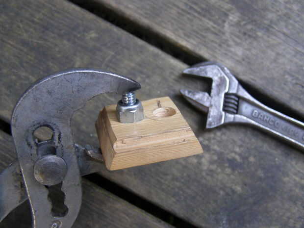 Con oferta limitada de la ferretería de pulgadas Tamaño de pernos di no tienen regular 1/4" tornillos, así que tuve que conseguir las tuercas, y puesto que la cabeza del perno fue incrustada en la madera no podía mantener todavía. Argh... Pero mi padre me enseñó a hacer :-)