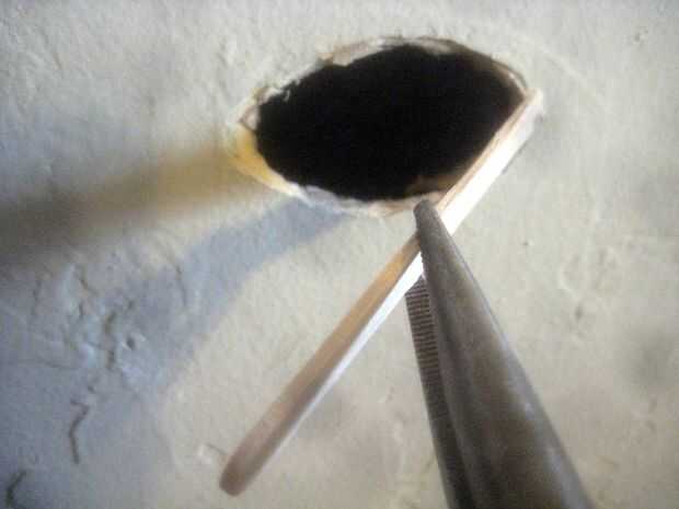 Poner un poco de pegamento caliente en cada extremo del palo y poner el palo aunque el agujero. Luego páselo firmemente contra las placas de pladur. Espere unos segundos para el pegamento caliente a firma para arriba. Debe probar y posición por lo que se pega al papel firme, evite los lugares donde ha tirar el papel dentro de la pared de yeso.