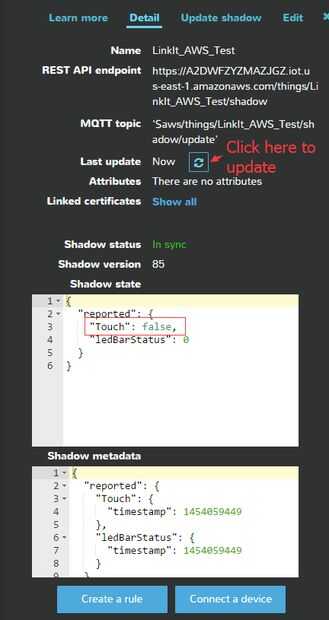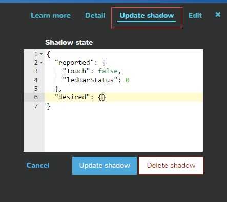 { "desired": {"ledBarStatus": 5 },"reported": { "Touch": false,"ledBarStatus": 0 }} A continuación, haga clic en sombra de la actualización, la barra de LED cambia a nivel 5.