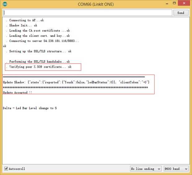 Cuando tienes ... X.509 certificazte... ok, significa que el dispositivo hubiera conectado a AWS exitosa. Si hay algo mal, por favor, restablecer un LinkIt y vuelva a intentarlo.