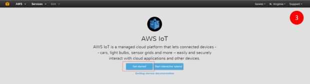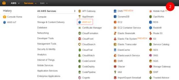 Haga clic en servicios en la esquina superior izquierda y luego haga clic en AWS IoT, (imagen 1 y 2)
