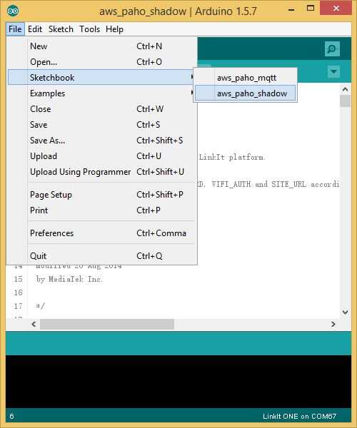 Cierre y reinicie el IDE de Arduino, haga clic en archivo > Sketchbook > aws_paho_shadow, entonces el código se abrirá.