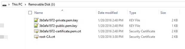 Copie los tres archivos que descargamos de AWS IoT en el disco.