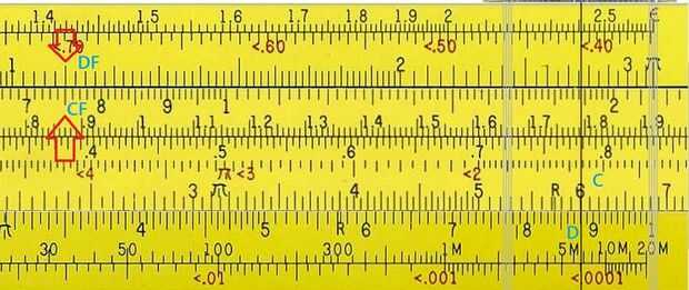 Véase el segundo gráfico. Establecer la línea del cabello a los 13 en la escala de D. Mueva el control deslizante para que 5 en la escala C1 aparezca debajo de la línea del cabello. Esto multiplica 5 por 13. Encontrar 3 en la escala de C1. Mueva el indicador sobre él. 21.6 de leer como la respuesta en la escala de D.