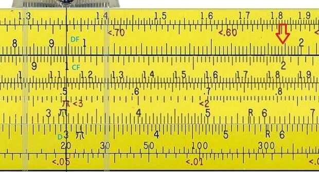 En el gráfico la línea del cabello es más de 15 en la escala de D. 15 x 3.1416 o pi es 47.2 en la escala de DF. (La respuesta real trabajada en una calculadora electrónica es 47.12, que está bastante cerca). Desde este punto, más pasos de un problema de pi se pueden acabar en las escalas de los CF y DF multiplicando como si fueran las escalas C y D. La ventaja es que no hay necesidad de transferir el producto de pi y otro número a la C y D para terminar el problema.