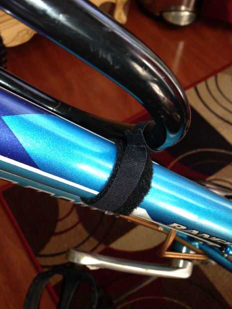 Usando un lazo del velcro envuelve la curva de la U con el gancho de lado (puntiagudos) hacia fuera. Aunque no es lo suficientemente fuerte para cierre en velcro envuelto alrededor del marco, puede desenvolver fácilmente y luego envuélvalo alrededor del marco para un asimiento fuerte.