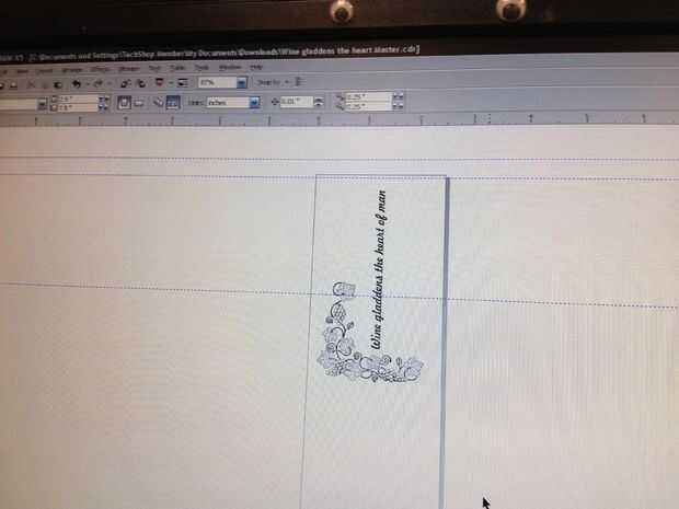 En la casa había hecho archivos de vides de uva y versos sobre el vino. El primer problema que me encontré en a que era mi obra de arte de la vid de uva muy fina las líneas demasiado delicadas para la máquina a reconocer. Finalmente tuve que trazar un diseño y aumentar el ancho de la pluma. (esto es en Corel Draw).