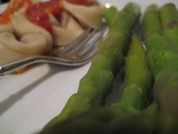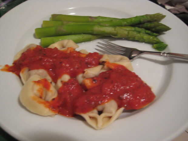 Ingredientes: Espárragos, tortellini, salsa de tomate comprada.