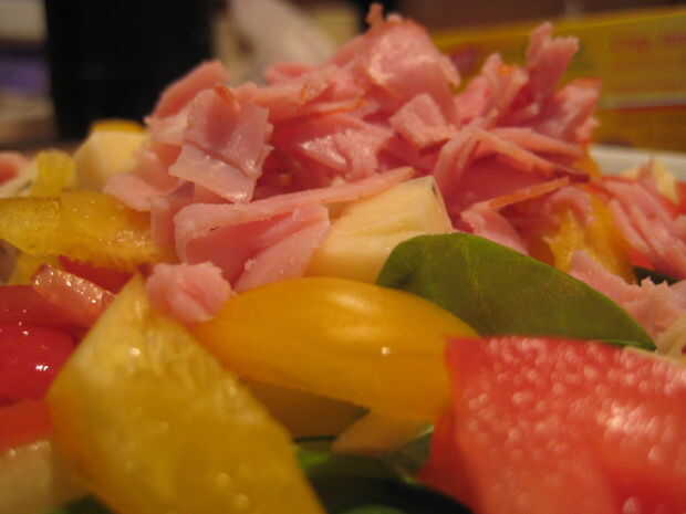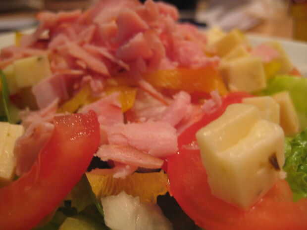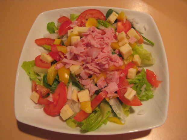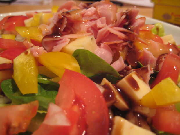 Ingredientes: Lechuga romana, espinaca baby, tomate, ají amarillo, queso de pepperjack, cebolla, jamón, vinagreta balsámica.