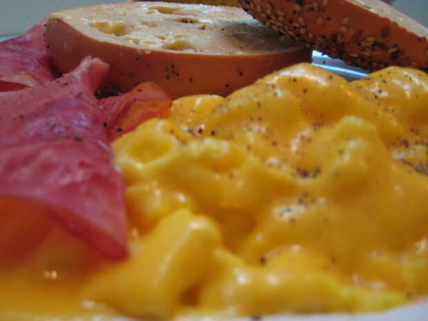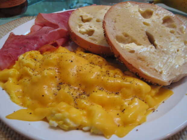 Éste incluye huevos revueltos con queso, jamón a la plancha y un bagel tostado.