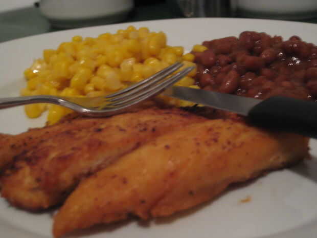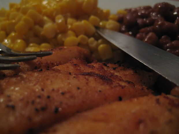 Ingredientes: comprada puede de maíz; store-bought lata de judías; paquete de rebanadas de pechuga de pollo.