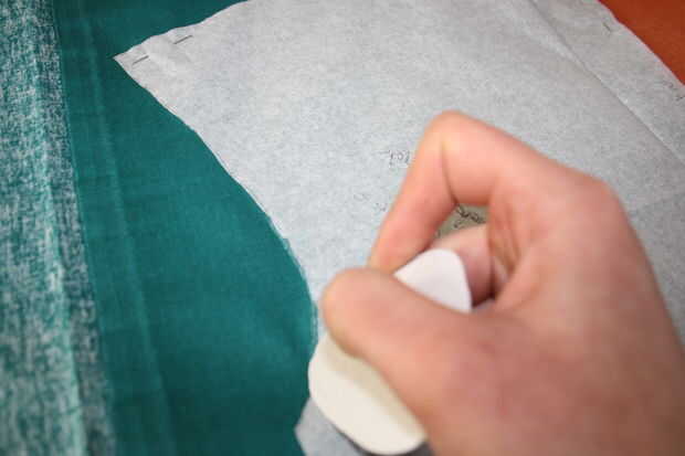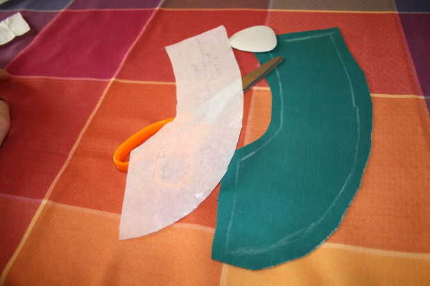 Usted crea su propio patrón en el papel, ahora está tallando en su tela. Ubicar el patrón con alfileres en la tela, trace las formas alrededor con una tiza. Corte a la tela alrededor de la traza a un centímetro del borde para los márgenes.