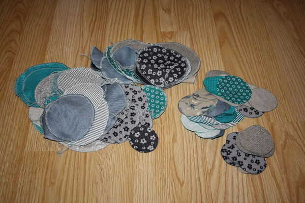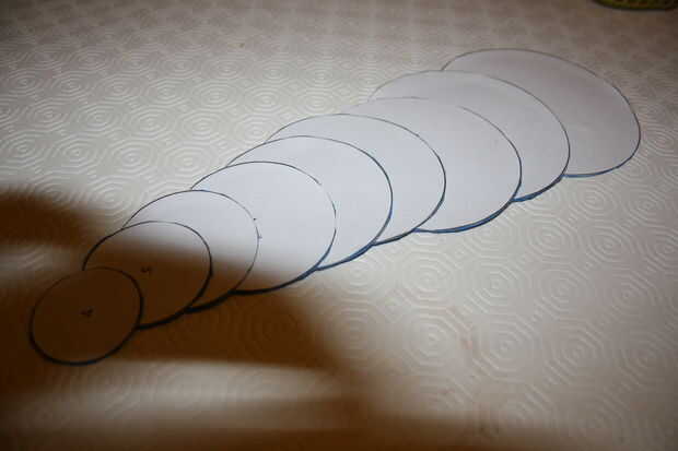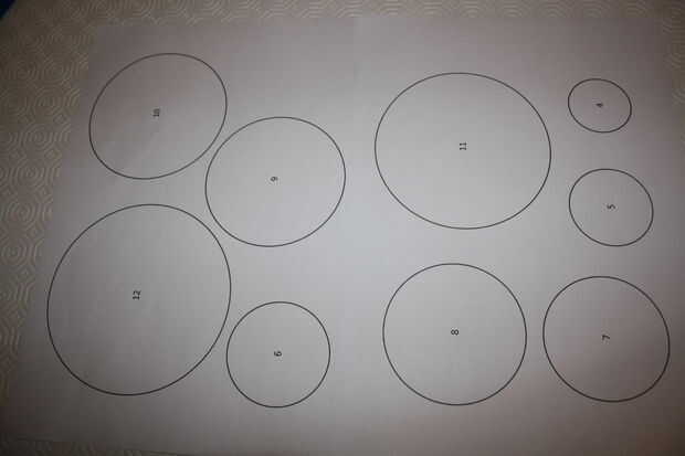 Aquí elegí los círculos, que no es la costura de forma más sencilla. Elegí hacer círculos de 4 cm a 12 cm de diámetro. Simplemente hice plantillas en PowerPoint, impreso, cortado, pegado sobre cartulina para fortalecerlas.