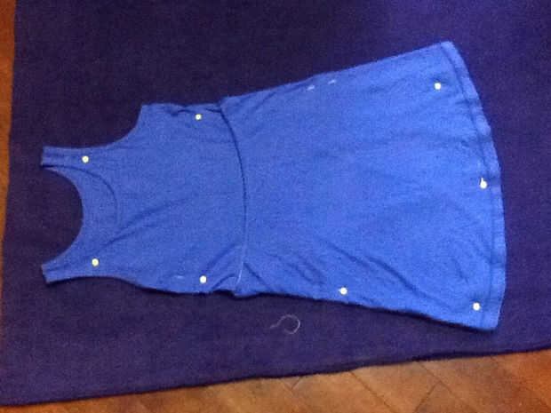 Ella tenía un vestido que realmente le gustaba en su armario, así que empecé con eso de utilizar como una plantilla. Tenía un metro de forro polar. Comencé doblando el forro polar en la mitad y colocar el vestido en la parte superior. Cuidadosamente lo aplanado y alisado todas las arrugas. Cubrió el vestido a la tela alrededor del perímetro.
