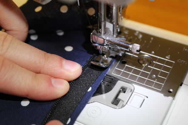 Cambiar el prensatelas normal en su máquina de coser a un pie de cremallera regular (estos vienen con la mayoría de las máquinas) y coser el cierre a la tela, manteniendo los dientes de la cremallera como cerca de la línea de margen de costura prensada como sea posible. Al llegar al final de la cremallera, backstich. Se trata de cómo resulta inicialmente, ok, pero aún no totalmente invisible...