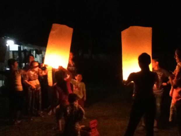 Después de la cena, Ar Ma - mi suegra y sus nietos flotan las linternas de la tapa para la buena suerte.
