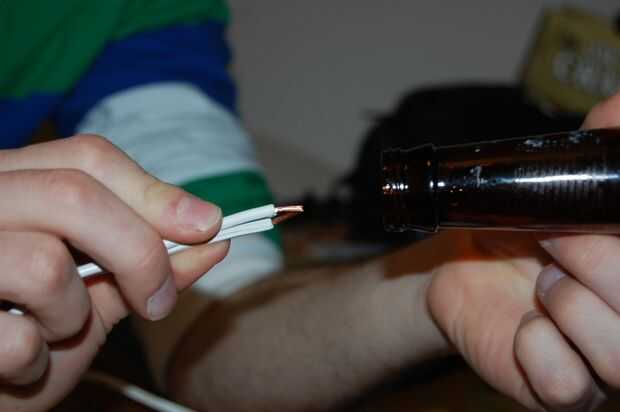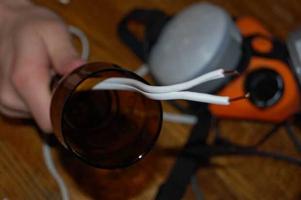 Tira de aproximadamente 1/4" de aislamiento de cada cable y el cable pelado por la parte superior de la botella cortada de la pisada.
