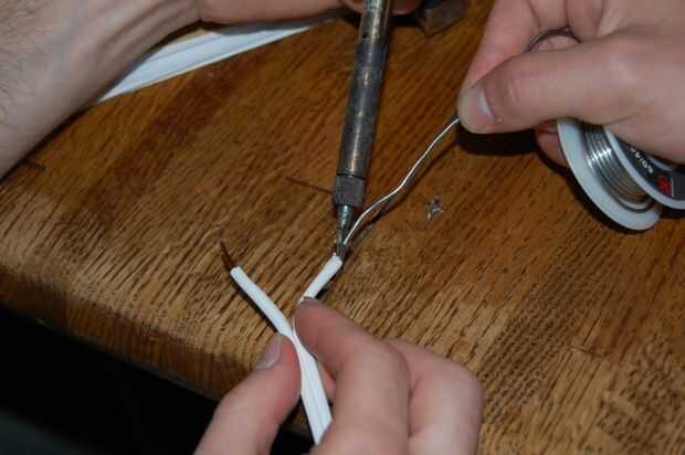 Usando el procedimiento estándar de la soldado, la soldadura de los extremos pelados del cable a los contactos metálicos.