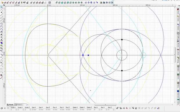 ahora nos dibuja 2 círculos, estos marca la parte de afuera de la costilla borde donde los círculos de pelea tocan, hay 128mm de radio, debe cruzar las líneas inferiores de 16mm (puntos azules)