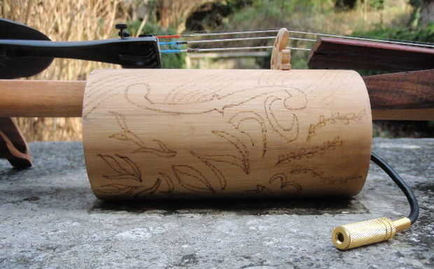 El mango está construido respetando las dimensiones exactas de un violín acústico y conserva las mismas referencias para la mano. Generalmente está hecha de roble, Mogán, buche... La parte superior tiene diferentes formas dependiendo del tipo de resonador para que es construido. Nos gusta especialmente la forma de un hoyo de la corona. La longitud total es de unos 63cm. Hay una referencia a la izquierda de la empuñadura para contrapesar el resto del hombro en el lado derecho. Fingerboards conservan el tamaño original y se hacen generalmente de padauk u oliva. Generalmente ponemos un diamante en forma de nudo de madera en medio del diapasón. Esta particularidad es típica de la madera de olivo.