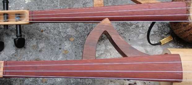 En primer lugar, hemos tratado diferentes tipos de resonadores de segmentos de bambú, cocos, calabazas o formas más complejas obtenidas mediante el uso de rodajas de madera. El resonador de alto rendimiento la mayoría fue un segmento de bambú cuya longitud era la mitad de la longitud de la cuerda total. Este resonador simple era muy rica en armónicos, y substain era larga duración. Sin amplificación, el sonido es suave y no molestar a los vecinos. Han intentado resonadores con piezas hechas de piel, metal, resortes, para elaborar y enriquecer el sonido mecánicamente.