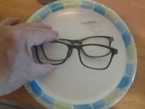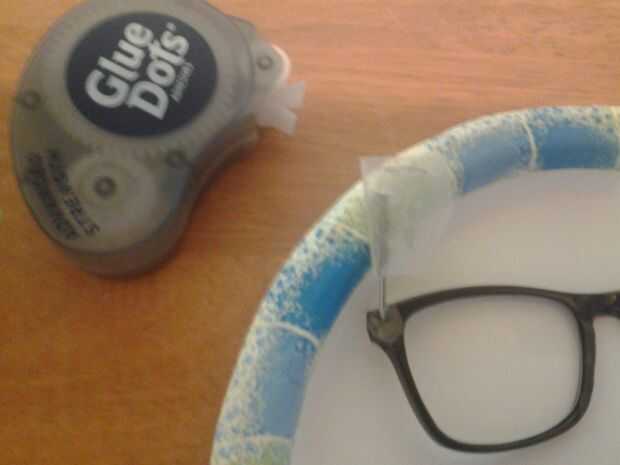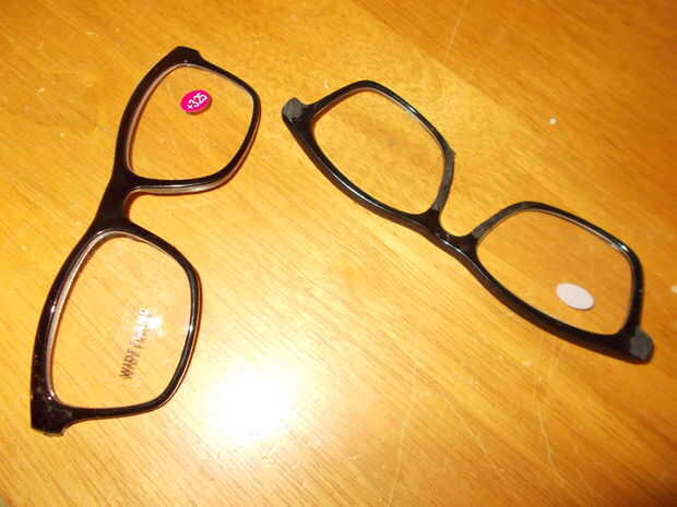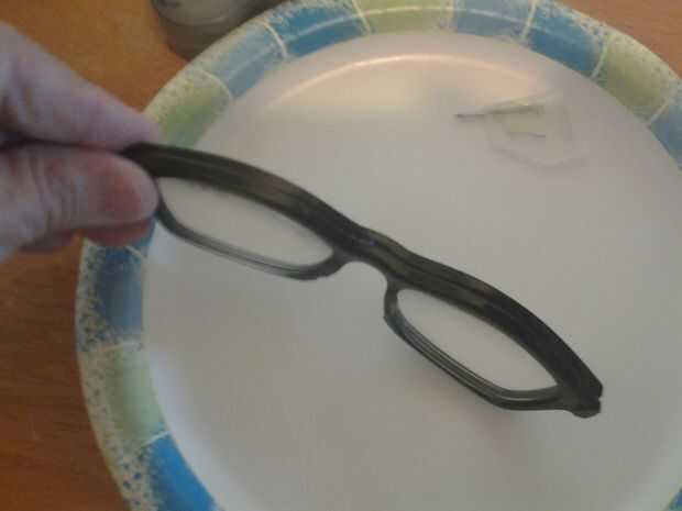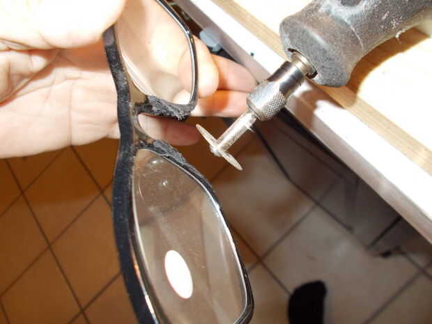 Utilizar una Dremel con una cuchilla de corte (diamante funciona muy bien), cortar los mangos y la novia de la nariz de ambos par de gafas. Después puntos de pegamento en el borde de las copas y en el puente de la nariz y pegan. Hecho!