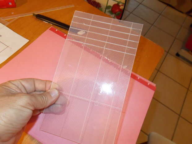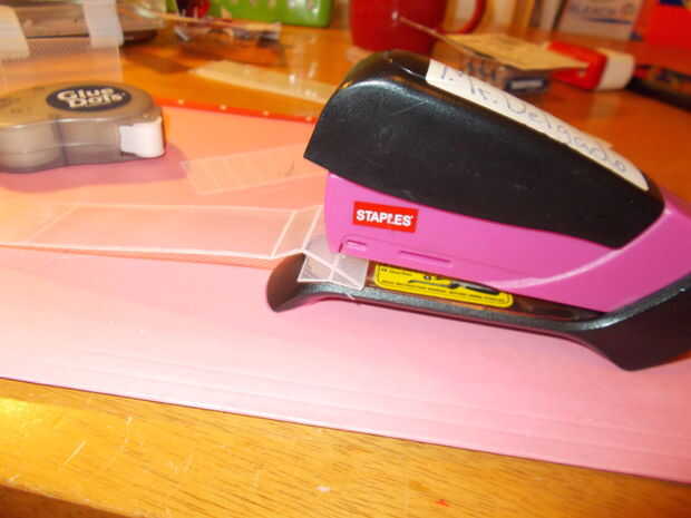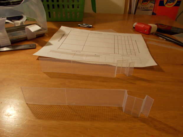 Cinta de plástico sobre la plantilla de los soportes y Escribano utilizando una regla. Luego cortar un soporte básico en la línea indicada y doblar como se muestra en la imagen. Repita para el segundo soporte.