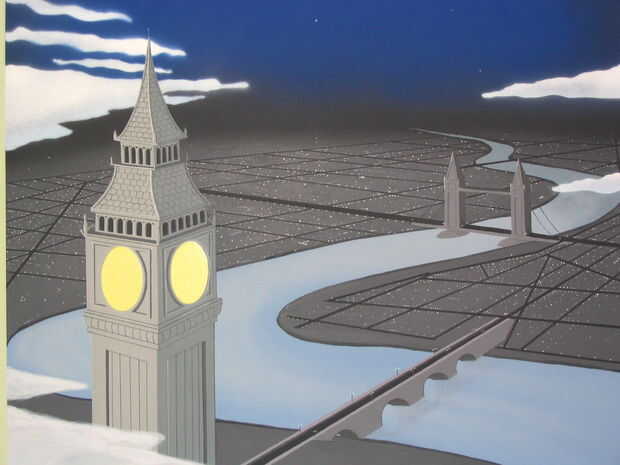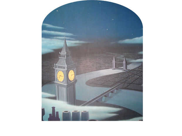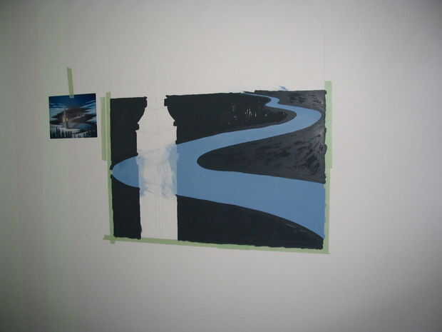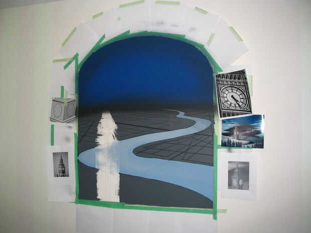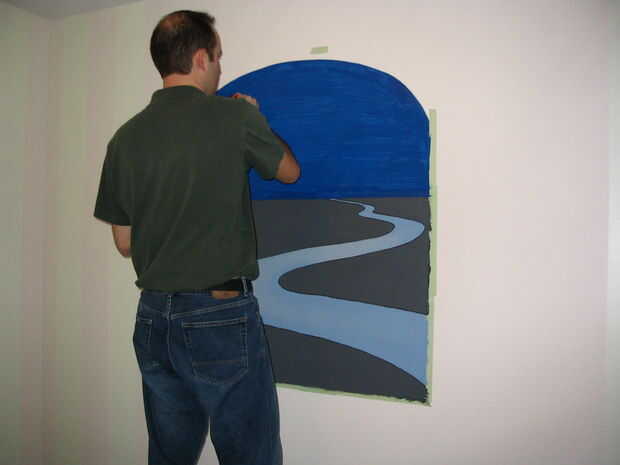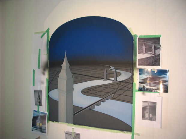 Tomó una foto del mural en un programa de gráficos, redibujó como formas básicas y luego imprimir en una transparencia para retroproyectores, que tomé prestado de mi hermana de maestro... Proyectando en la pared, traza las formas con el lápiz. Había enmascarado de alrededor de él y comenzó a pintar. Utilicé pinturas arcylic de la artesanía local. cepillado a casi todos, excepto algunos aerografía luz del cielo, con un aerógrafo muy barato.