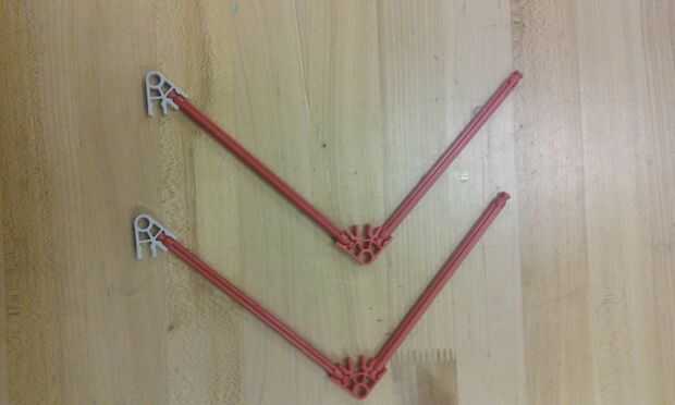 Conecte uno de los palos rojos a los conectores de 45 grados de gris en cada pie.