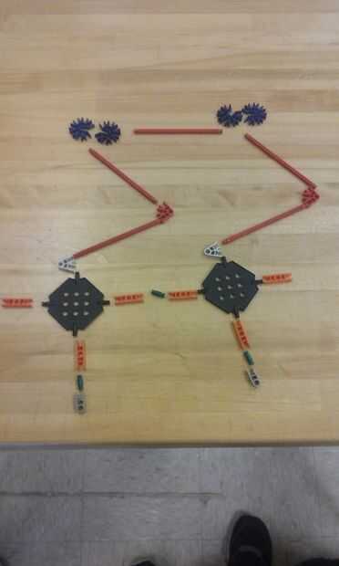 Conectar los 2 sets de piezas azul entrelazados con un palillo rojo.