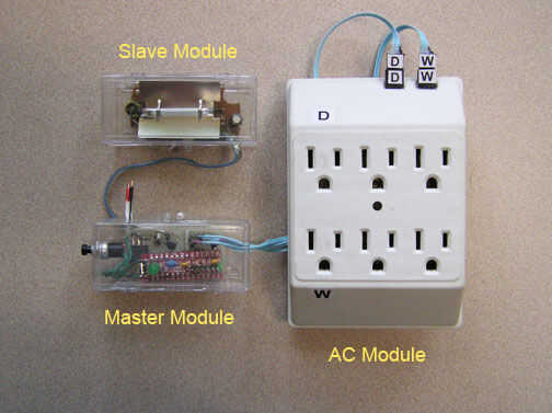 1 el módulo de AC proporciona 120 VAC a la lavadora y la secadora y cuando detecta cualquier uno es actual dibujo. Cuando la corriente se detiene, se envía una señal al módulo principal. El módulo de AC es un receptáculo de 6 maneras comunes que se modifica para este proyecto.