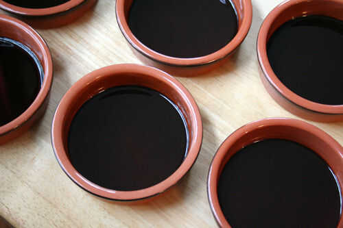 4. una vez que se cuela el jarabe, añadir lo suficiente para la parte inferior de tus moldes de flan para cubrir la parte inferior.